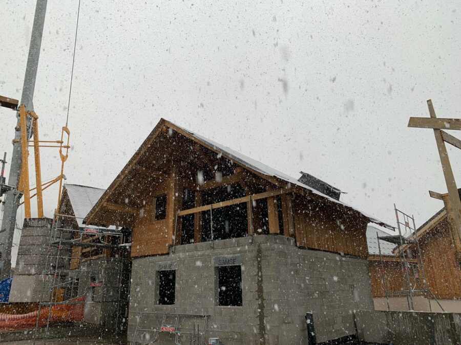 Le chantier des Lodges de Valloire sous les premiers flocons de neige. Rien ne rebute nos équipes : par toutes les météos, elles assurent le bon déroulé de votre projet !!