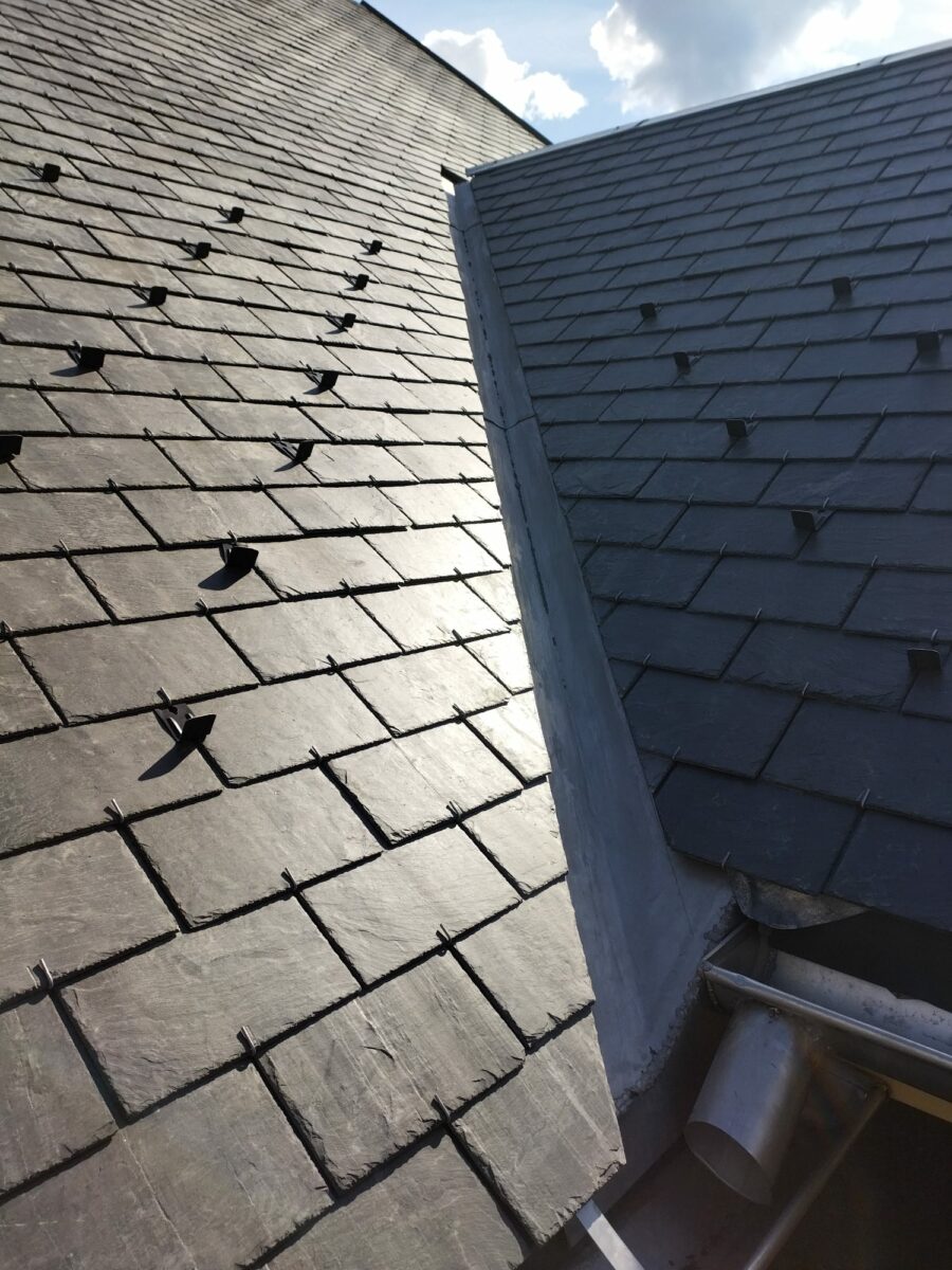 Nos équipes d’LGO ont bien travaillé sur ce chantier conséquent. Découverture de l’ancienne toiture en ardoise naturelle, dressage de la charpente et remplacement des chevrons et pannes abîmées. Création de 5 chevêtres pour velux, et pose de la nouvelle couverture toujours en ardoise naturelle. Un très belle ensemble qui permet à cette maison de repartir…