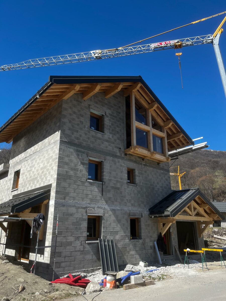 Construction d’une maison à Valloire. Maçonnerie réalisée par LGO, charpente taillée par l’Atelier de François puis posée et couverte par LGO qui s’est également occupé de l’isolation et pare-vapeur intérieur. Un beau travail d’équipe.
