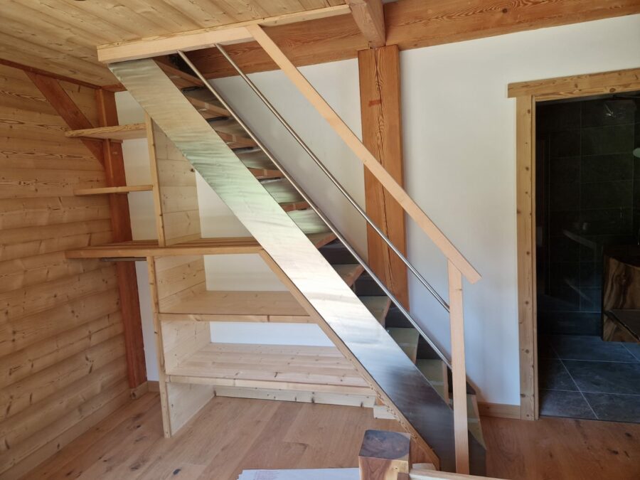 Une belle échelle de meunier posée à Notre-Dame-de-Bellecombe. Une composition bois et métal agrémentée d’un rangement sous pente.