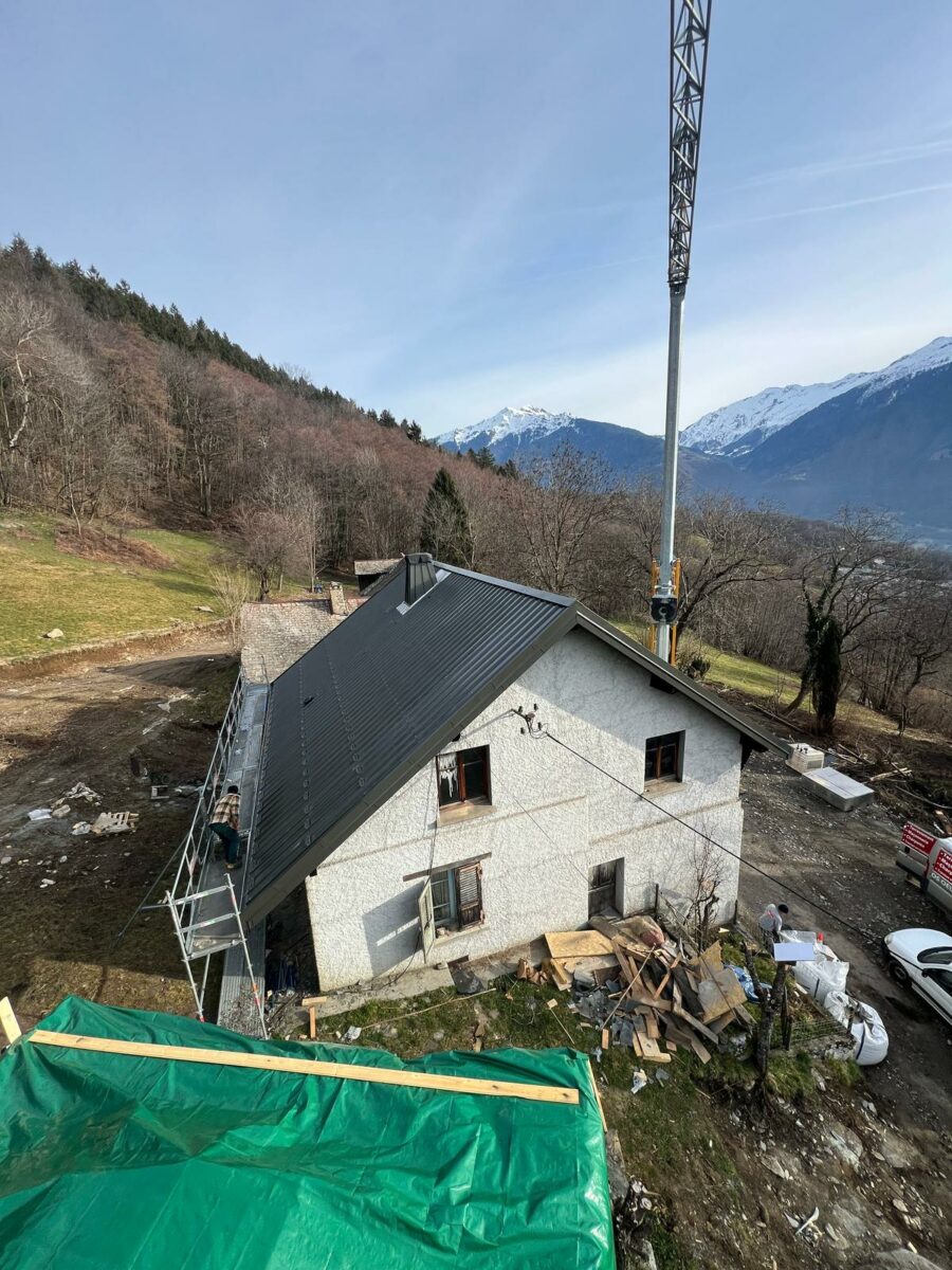 Gros chantier à Saint-Georges d’Hurtières pour cette maison. Son ancienne couverture en ardoise fait place à un bac acier pour affronter le climat mauriennais !