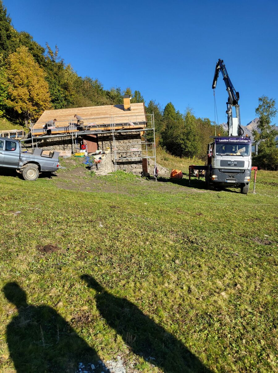 Démontage de la grue LGO avec la neige en décor, ça sent la fin de chantier ! : nouvelle livraison de deux superbes chalets à Valloire Galibier